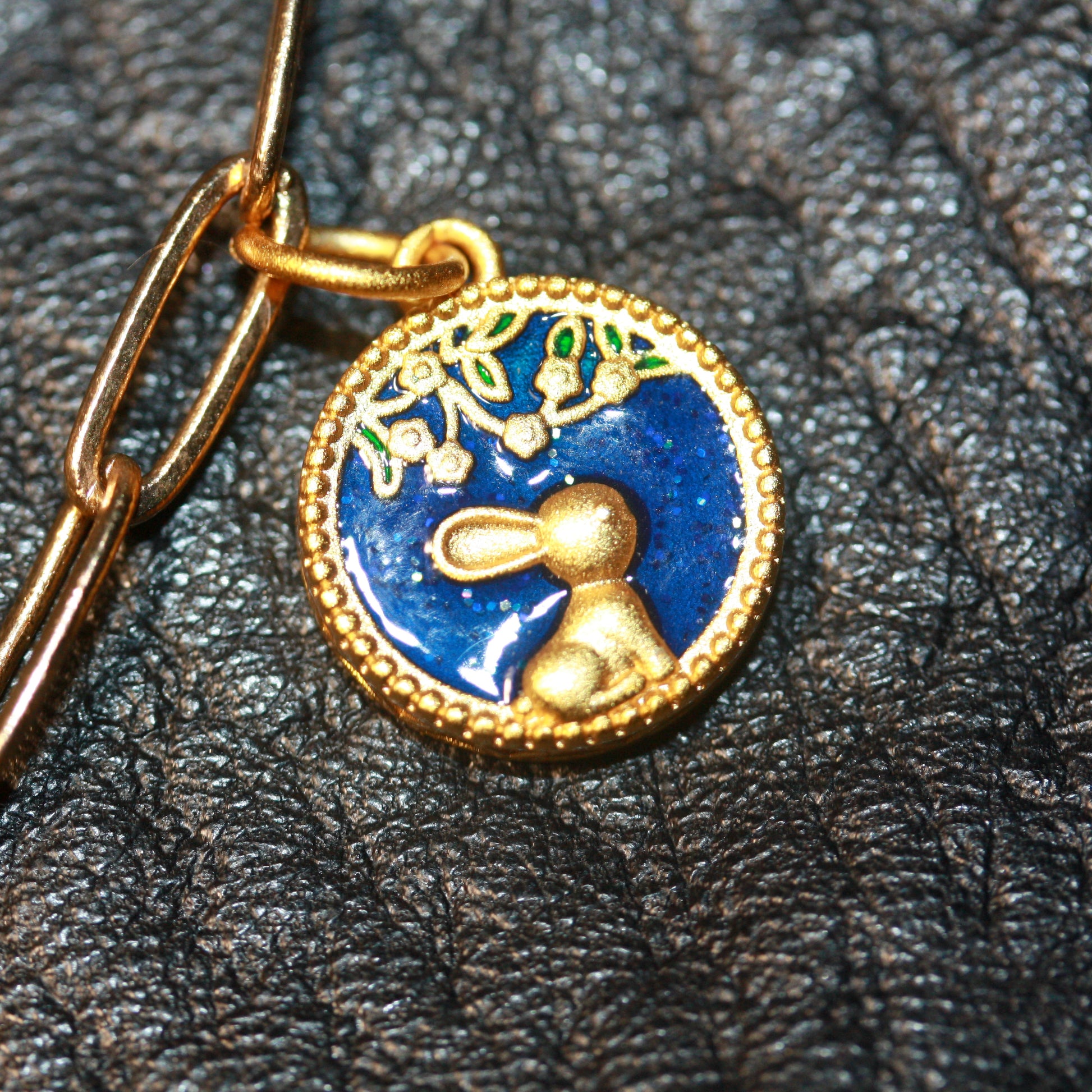 5. To the right of the main pendant a blue glitter enamel pendant with a golden rabbit.
