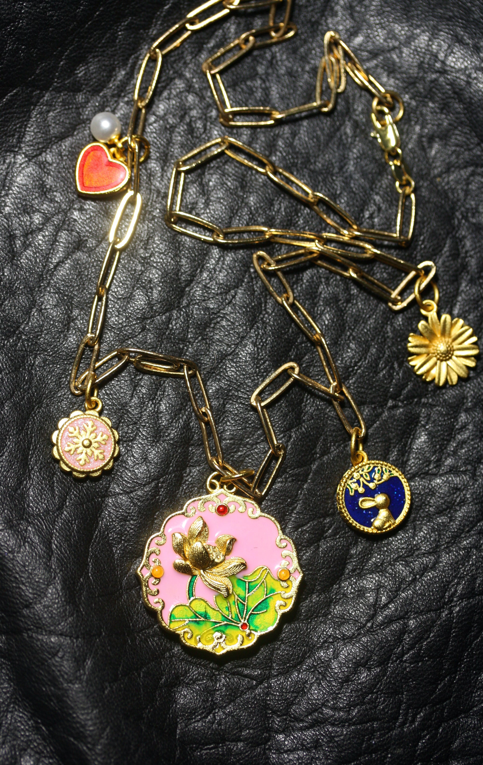 A fun easy to wear hand curated one off necklace. Six golden non - tarnish charms hanging from a vintage style brass paper link chain. The large main pendant is reversible . The golden charmed delight can be worn long or shorter.