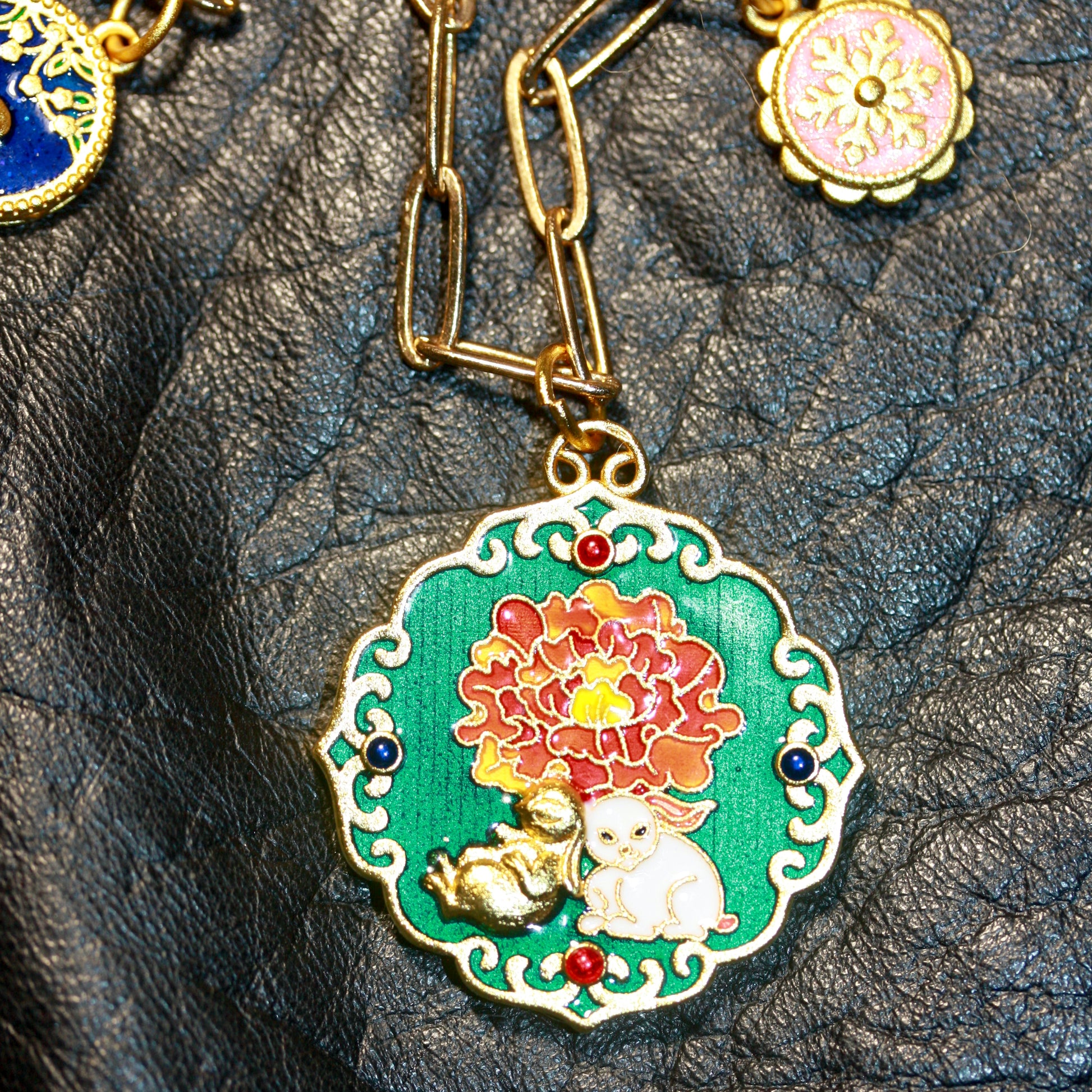 1. Reversible Center pendant one side golden lotus flower with pink and green enamel other side orange red peony flower with golden rabbit and cat on a green enamelled background. Please scroll through photos to see . 35mm long by 33mm wide